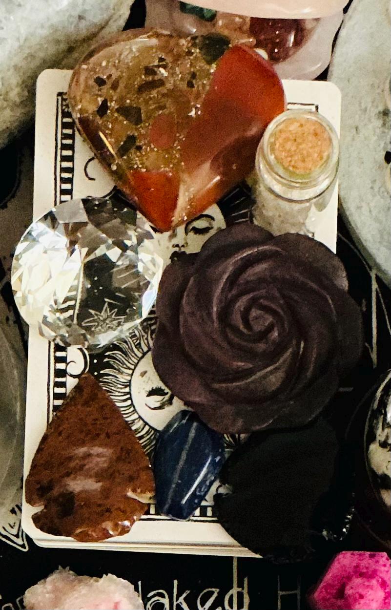 LOVIN' The Glowing Ruby Rose w/Kyanite & UV Light ability! It's currently hanging out with The Heroine Tarot! Thank You, Mishelay Designs!